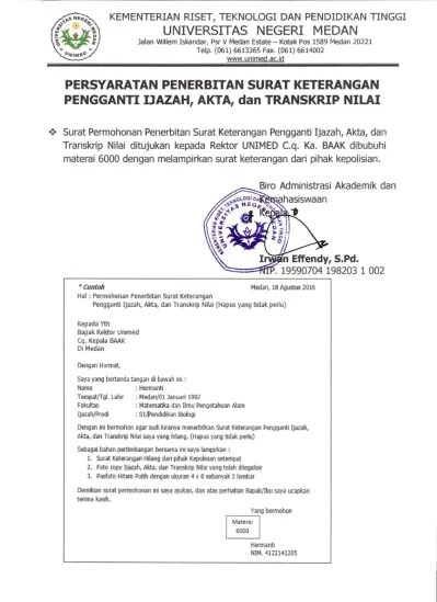 Surat laporan kehilangan ijazah dari kepolisian apabila ijazah hilang 3. Layanan permohonan surat keterangan pengganti. Persiapkan waktu dan diri · 3. Mengajukan permohonan pengganti ijazah dan/atau transkrip yang hilang atau rusak kepada rektor um. Ijazah yang rusak apabila ijazah rusak 4.